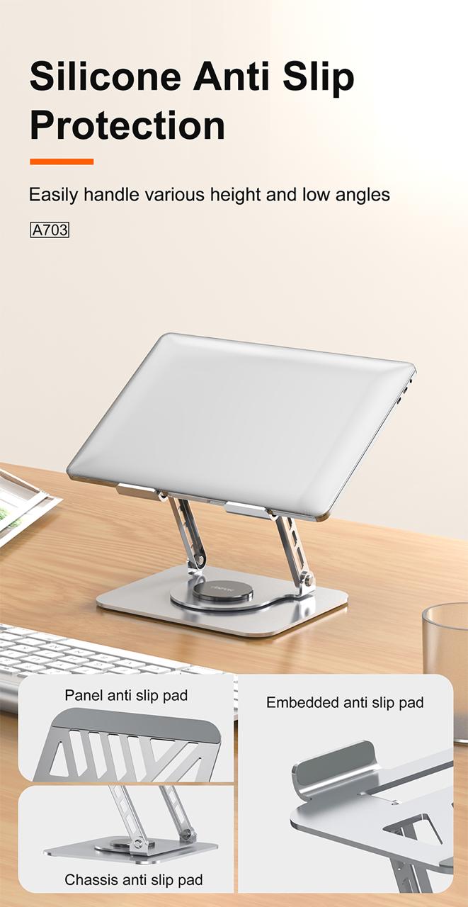 حامل اللابتوب ASPOR A703 مصنوع من الفولاذ الكربوني والسيليكون لتوفير ثبات ممتاز وحماية لجهازك من الانزلاق أو الخدوش. يتميز بتصميم قابل للطي وسهل الحمل، مما يجعله مثاليًا للاستخدام في المكتب أو أثناء التنقل.
