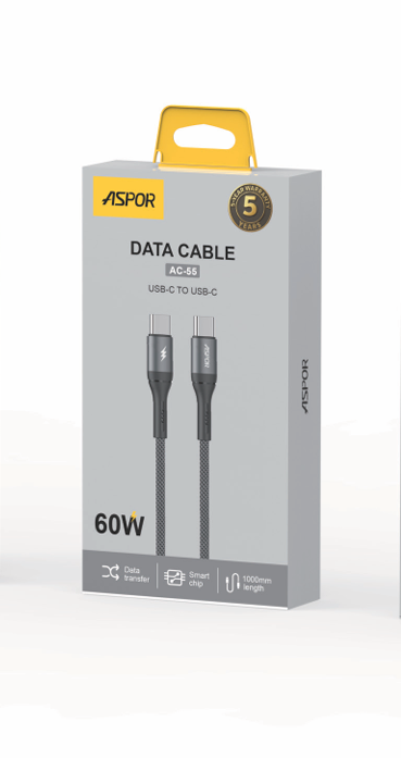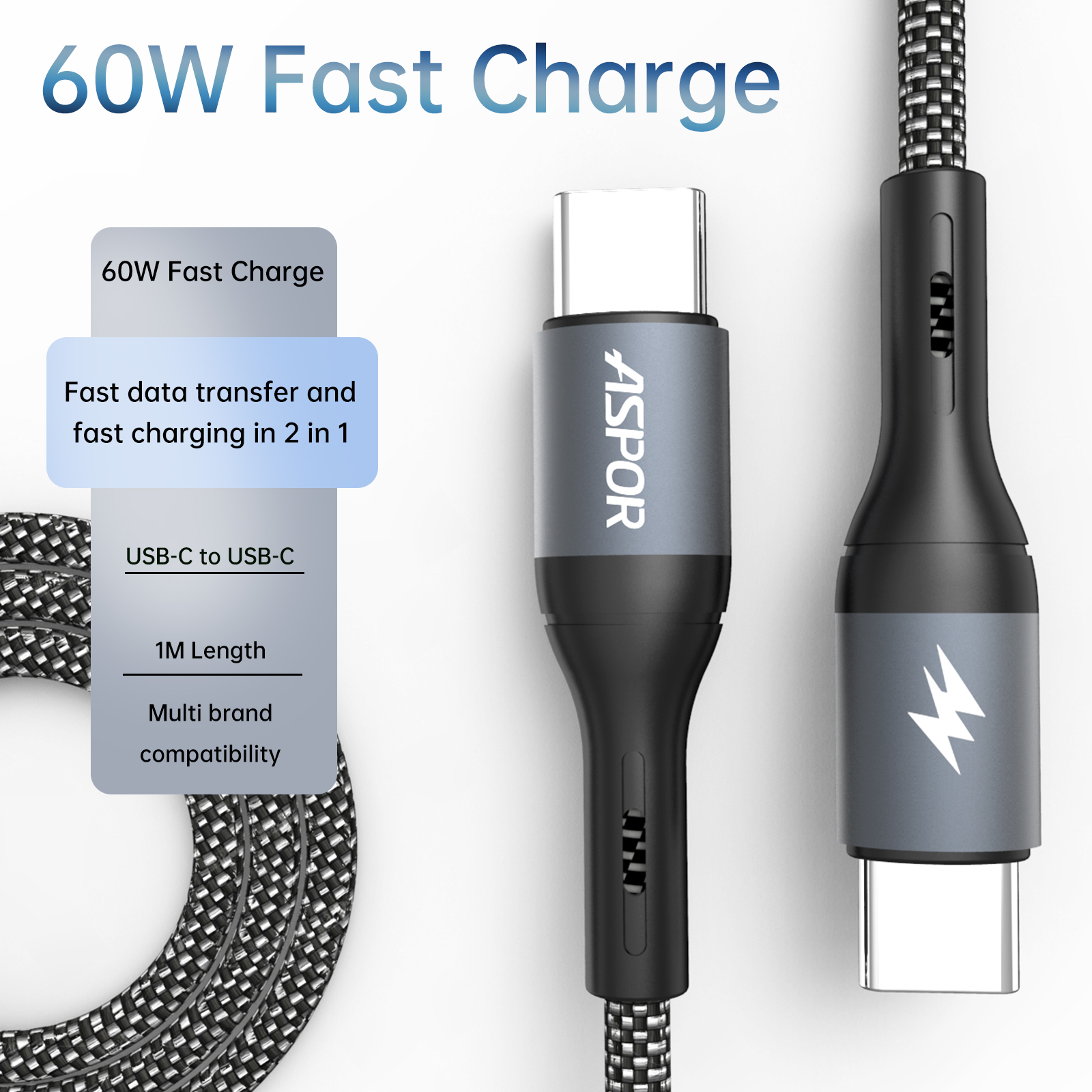 كابل بيانات ASPOR AC-55 USB-C إلى USB-C بقوة 60 واط وطول 1 متر