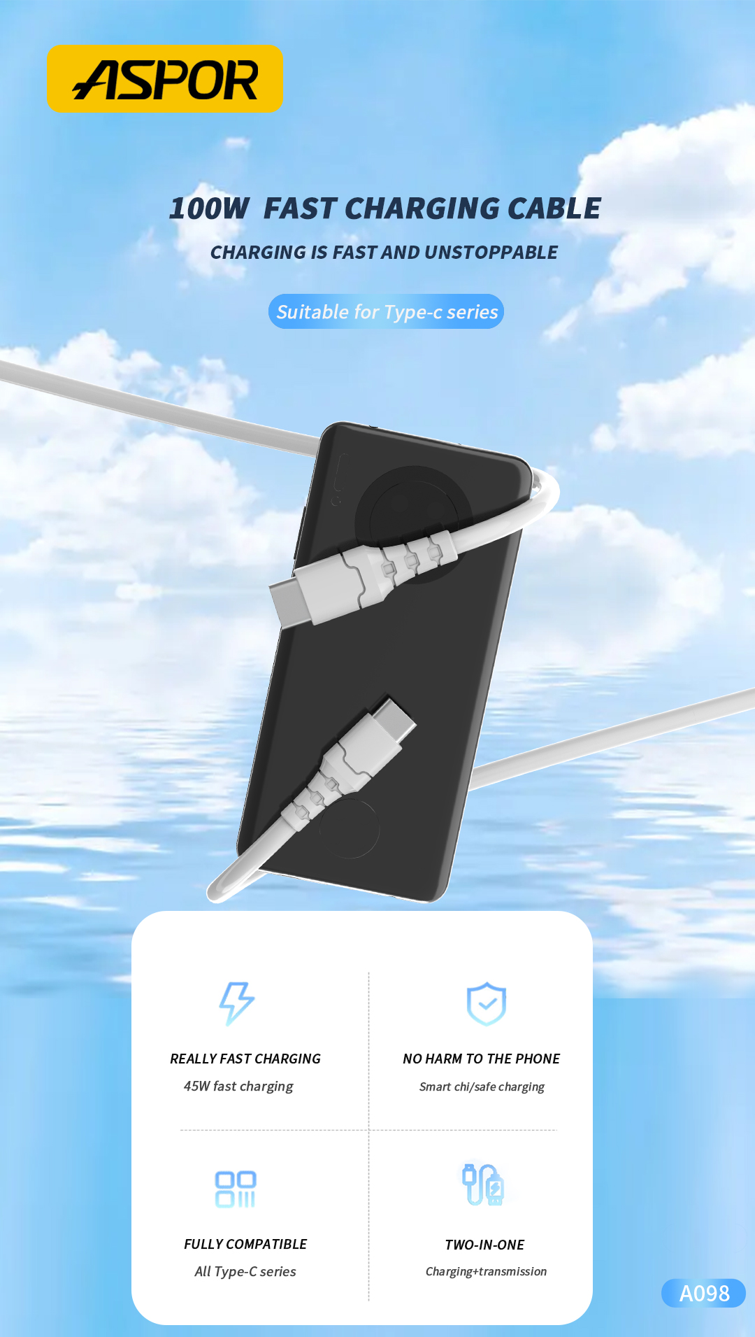 تمتع بأداء فائق وسرعة عالية في الشحن ونقل البيانات مع كابل ASPOR A098 المصمم بجودة عالية ليدعم جميع أجهزتك الحديثة.
